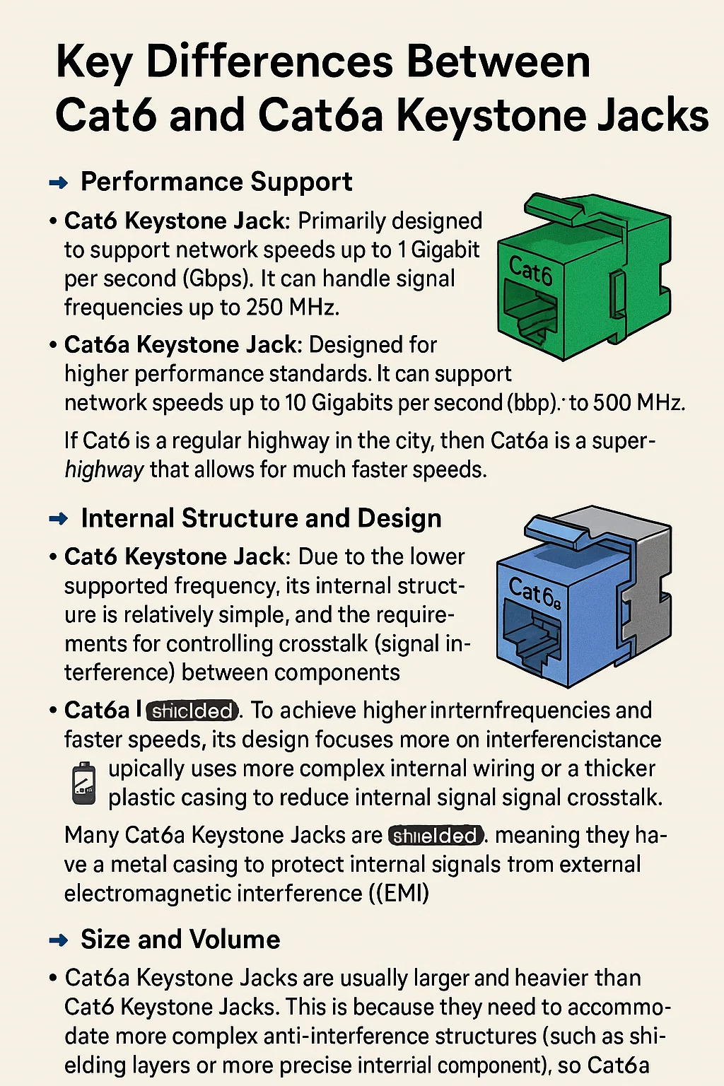 • Cat6a Keystone Jack: Korkeampien taajuuksien ja nopeampien nopeuksien saavuttamiseksi sen suunnittelu keskittyy enemmän häiriönkestävyyteen.