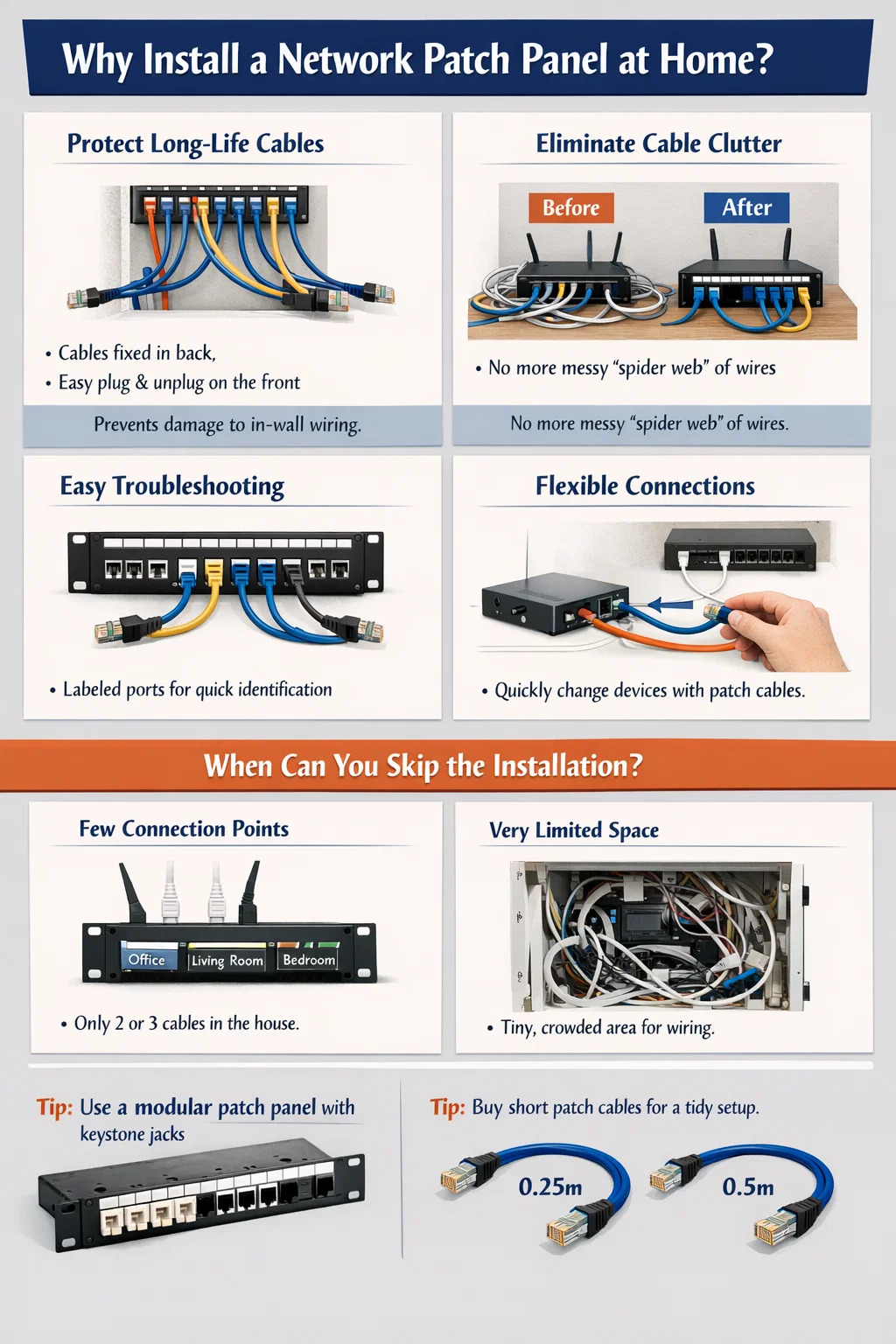 Joissakin vanhemmissa taloissa on erittäin pienet pienjännitelaatikot, joihin ei yksinkertaisesti mahdu tavallista verkon patch-paneelia. Tässä tapauksessa asennuksen pakottaminen tekee sisätiloista vain ruuhkaisemman.