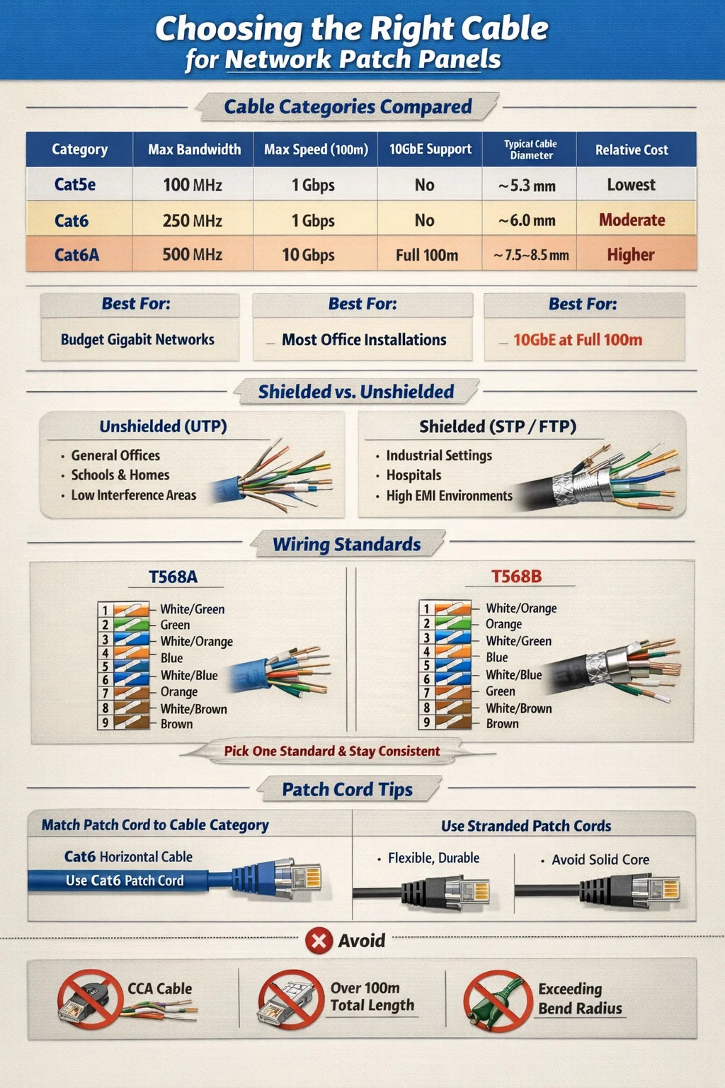 Kun on kyse verkkokorjauspaneelit , Cat6 suojaamaton kierretty parikaapeli (UTP) on yleisimmin suositeltu ja laajalti käytetty valinta useimpiin yritys- ja kotiverkkoympäristöihin. Se löytää oikean tasapainon suorituskyvyn, kustannusten ja tulevaisuudenkestävyyden välillä. Paras kaapeli tietylle paikkapaneeliasetukselle riippuu kuitenkin nopeusvaatimuksistasi, kaapelin pituudesta, häiriöolosuhteista ja budjetista. Cat5e on edelleen täysin käyttökelpoinen gigabit-verkoissa pienellä budjetilla, kun taas Cat6A on 10 GbE-asennuksiin tai suuritiheyksisiin tietokeskuksiin.