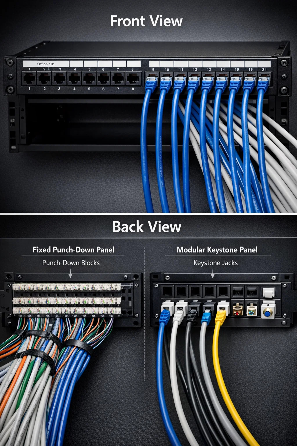 Täysin asennettuna näet takaosaan putoavan kaapeleita, jotka on siististi sidottu vetoketjulla tai tarranauhalla. Edessä, lyhyet patch-kaapelit (yleensä 0,5-3 jalkaa pitkiä) kattaa paneelin ja verkkokytkimen välinen kuilu. Tämä luo puhtaan, pystysuoran "paikalluksen" ilmeen, joka estää sotkeutuvan "spagettisotun", jota usein esiintyy amatööriasennuksissa.