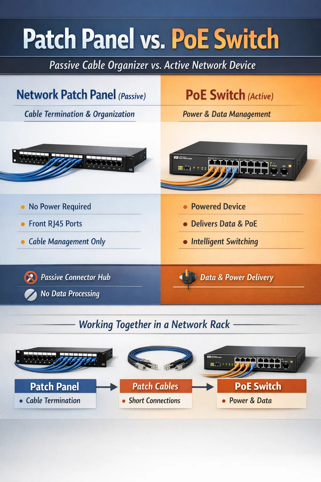 Ammattimaisessa asennuksessa nämä kaksi eivät ole kilpailijoita vaan kumppaneita. Patch-paneeli tarjoaa staattisen laskeutumiskohdan kaikille rakennusjohdoille, ja PoE-kytkin tarjoaa liitettävyyden ja virran, joita tarvitaan, jotta nämä johdot saadaan toimimaan laitteissa, kuten IP-kameroissa, VoIP-puhelimissa ja langattomissa tukiasemissa.